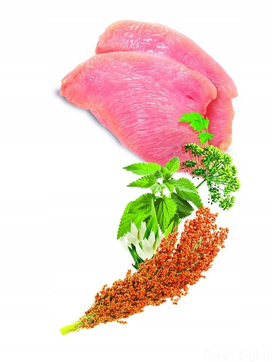Skład: mączka drobiowa (25%), kukurydza, sorgo (9%), tłuszcz drobiowy, groch, ryż, białko kukurydziane, hydrolizowane wątróbki drobiowe, suszone jabłka (2%), wysłodki buraczane, siemię lniane, drożdże piwne, olej kokosowy, MOS (mannanooligosacharydy), FOS (fruktooligosacharydy), betaglukany, kompleks ziołowy (pokrzywa, owoc anyżu, Yucca schidigera 0,032%), dodatki (witaminy, mikroelementy, aminokwasy).