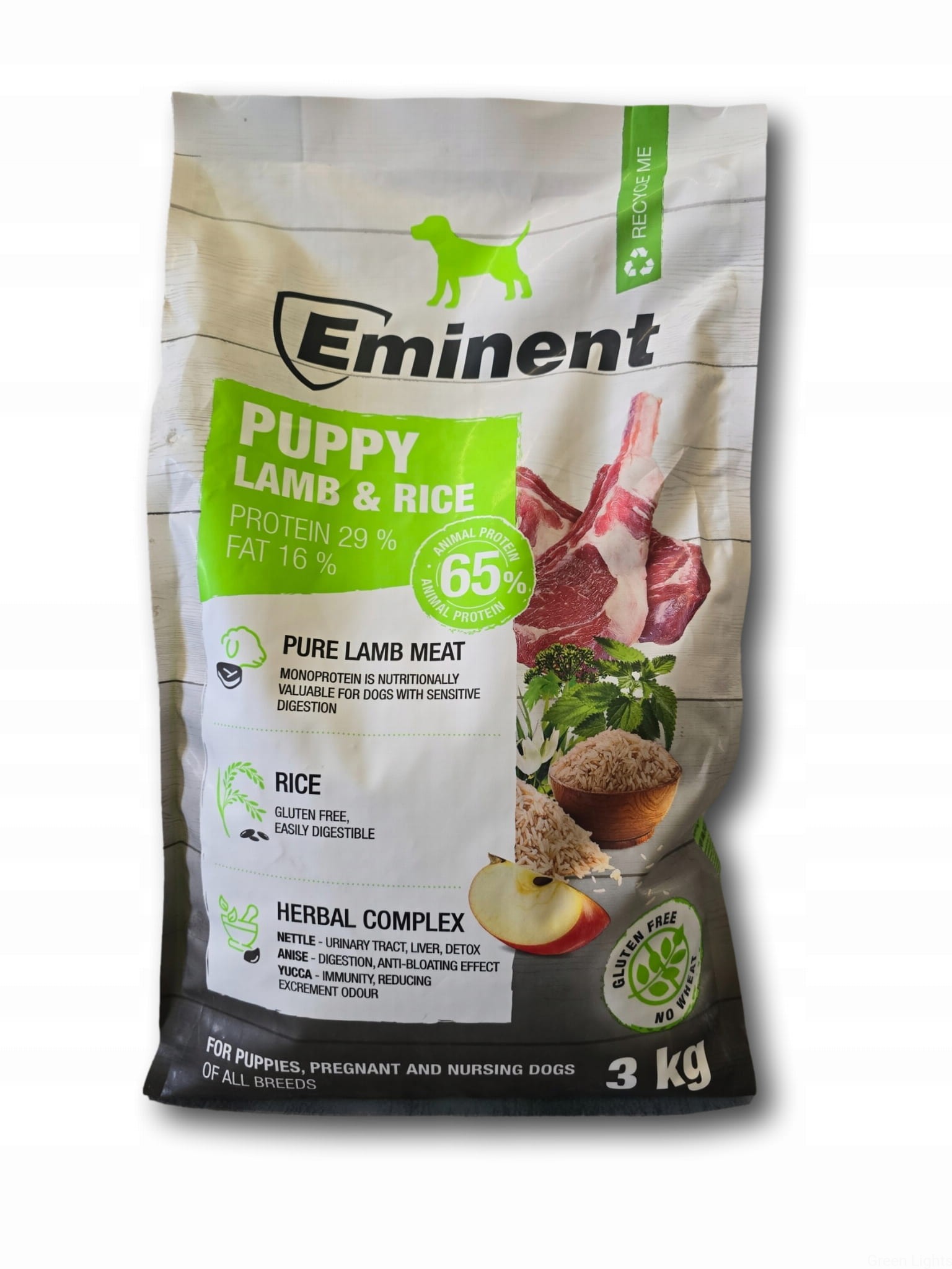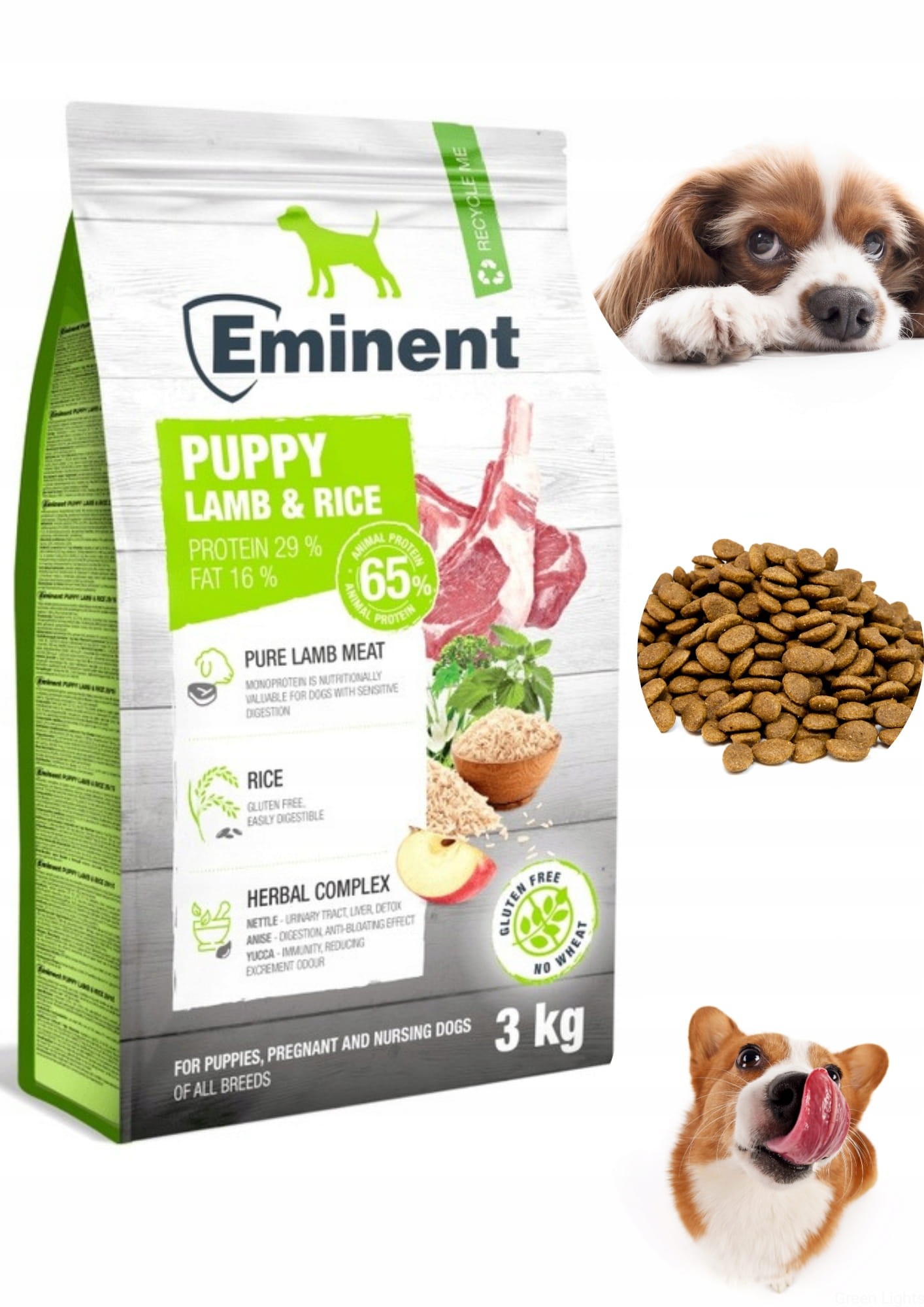 Karma Eminent Puppy Lamb&Rice 29/16 zawiera minimum 65% białka pochodzenia zwierzęcego, które charakteryzuje się wysoką strawnością
