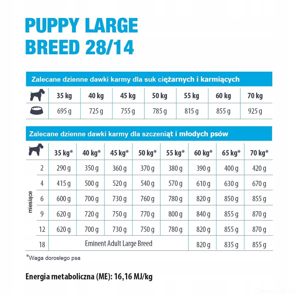 Karma dostarcza niezbędne składniki odżywcze i energię szczeniąt dużych i bardzo dużych ras, zapewniając odpowiedni wzrost i rozwój mięśni i kości. Karma jest polecana także dla suk szczennych lub karmiących dużych i bardzo dużych ras.