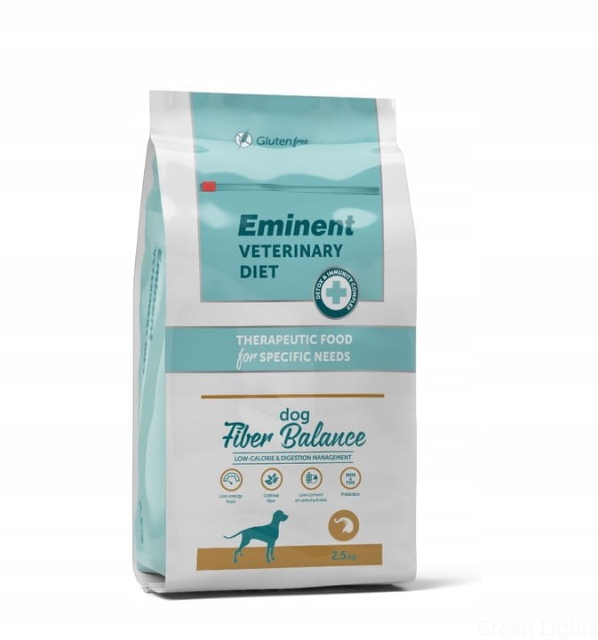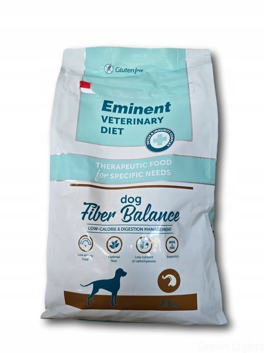Eminent Veterinary Diet Fiber Balance to karma o obniżonej zawartości tłuszczu i wartości energetycznej oraz o zwiększonej zawartości błonnika, sodu i potasu. Zawiera optymalne proporcje błonnika rozpuszczalnego i nierozpuszczalnego, co pozytywnie wpływa na redukcję masy ciała u psów otyłych oraz poprawia kondycję psów cierpiących na zaparcia. Ponieważ karma ma niską zawartość cukrów prostych i disacharydów, jest odpowiednia dla psów z cukrzycą. Wyniki pokazały, że utrata masy ciała została osiągnięta u wszystkich psów po 2 miesiącach stosowania tej diety. Ogólny wpływ diety oceniano za pomocą wyników sprawności (Body Condition Score). Stan wszystkich psów poprawił się. Po zastosowaniu diety u psów chorych na cukrzycę, poziom glukozy we krwi powrócił do normalnego fizjologicznego zakresu, gdy dietę połączono z odpowiednimi lekami.