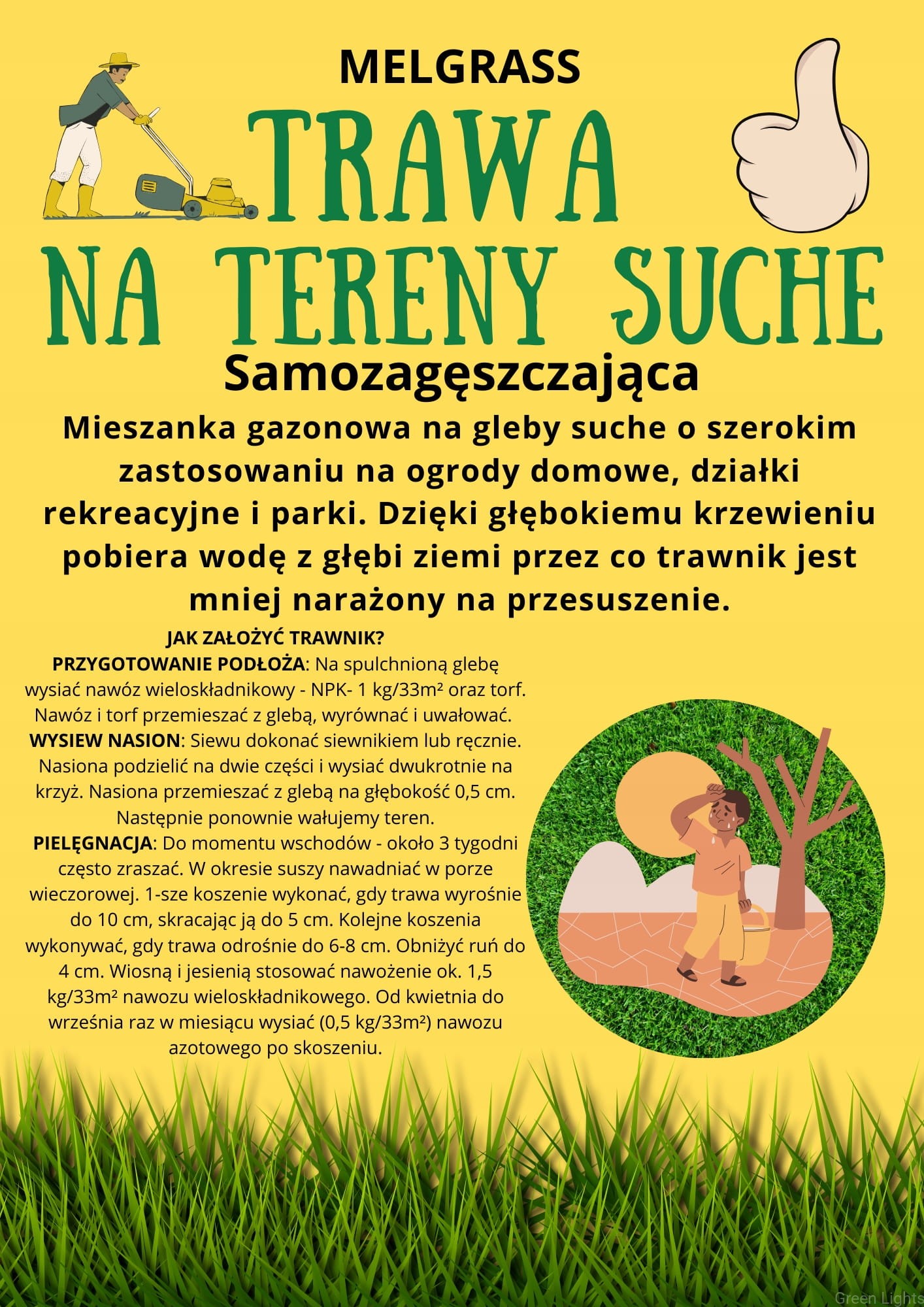 Trawa na tereny suche o szerokim zastosowaniu oraz wysokiej odporności na zmienne warunki atmosferyczne. Trawa Melgrass charakteryzuje się intensywnością krzewienia, wzrostem oraz wysoką odpornością na uszkodzenia mechaniczne. Mieszanka skomponowana aby trawnik był reprezentatywny, gęsty i cieszył oko właściciela :)