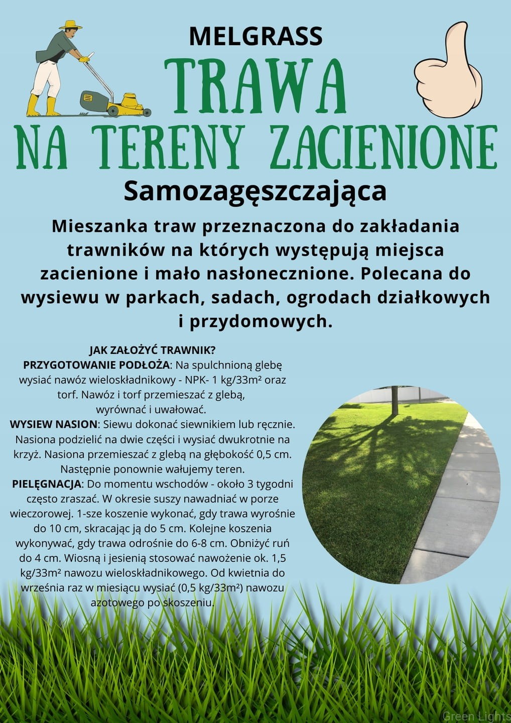 Trawa na tereny zacienione o szerokim zastosowaniu oraz wysokiej odporności na zmienne warunki atmosferyczne. Trawa Melgrass charakteryzuje się intensywnością krzewienia, wzrostem oraz wysoką odpornością na uszkodzenia mechaniczne. Mieszanka skomponowana aby trawnik był reprezentatywny, gęsty i cieszył oko właściciela :)
