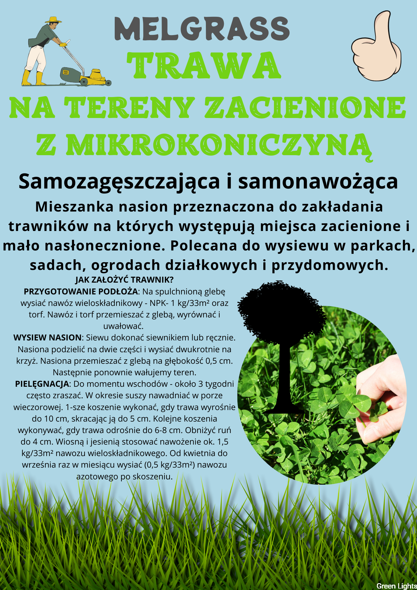 Trawa z mikrokoniczyną na tereny zacienione o szerokim zastosowaniu oraz wysokiej odporności na zmienne warunki atmosferyczne. Trawa Melgrass charakteryzuje się intensywnością krzewienia, wzrostem oraz wysoką odpornością na uszkodzenia mechaniczne. Mieszanka skomponowana aby trawnik był reprezentatywny, gęsty i cieszył oko właściciela :)
