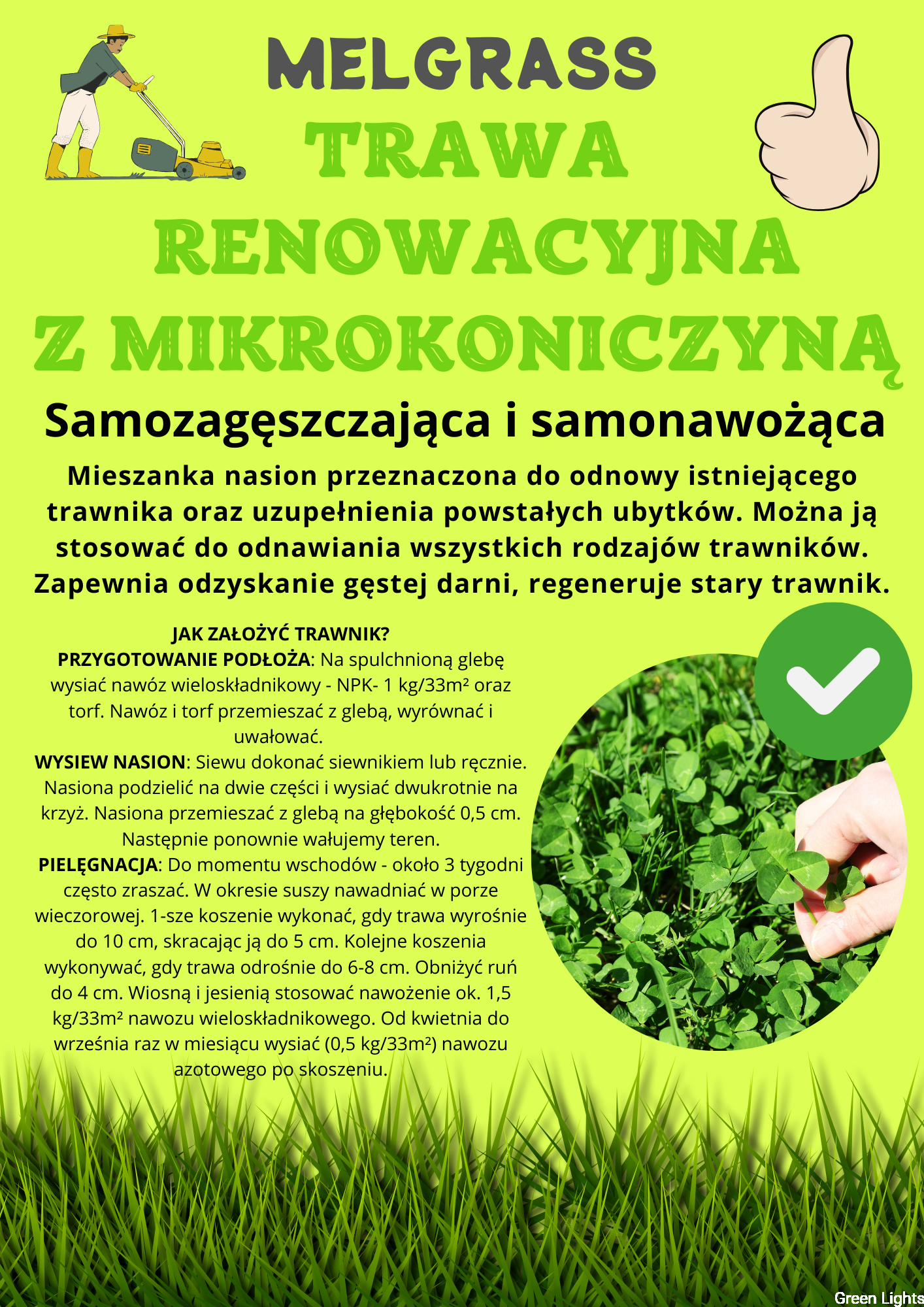 Trawa renowacyjna z mikrokoniczyną o szerokim zastosowaniu oraz wysokiej odporności na zmienne warunki atmosferyczne. Trawa Melgrass charakteryzuje się intensywnością krzewienia, wzrostem oraz wysoką odpornością na uszkodzenia mechaniczne. Mieszanka skomponowana aby trawnik był reprezentatywny, gęsty i cieszył oko właściciela :)