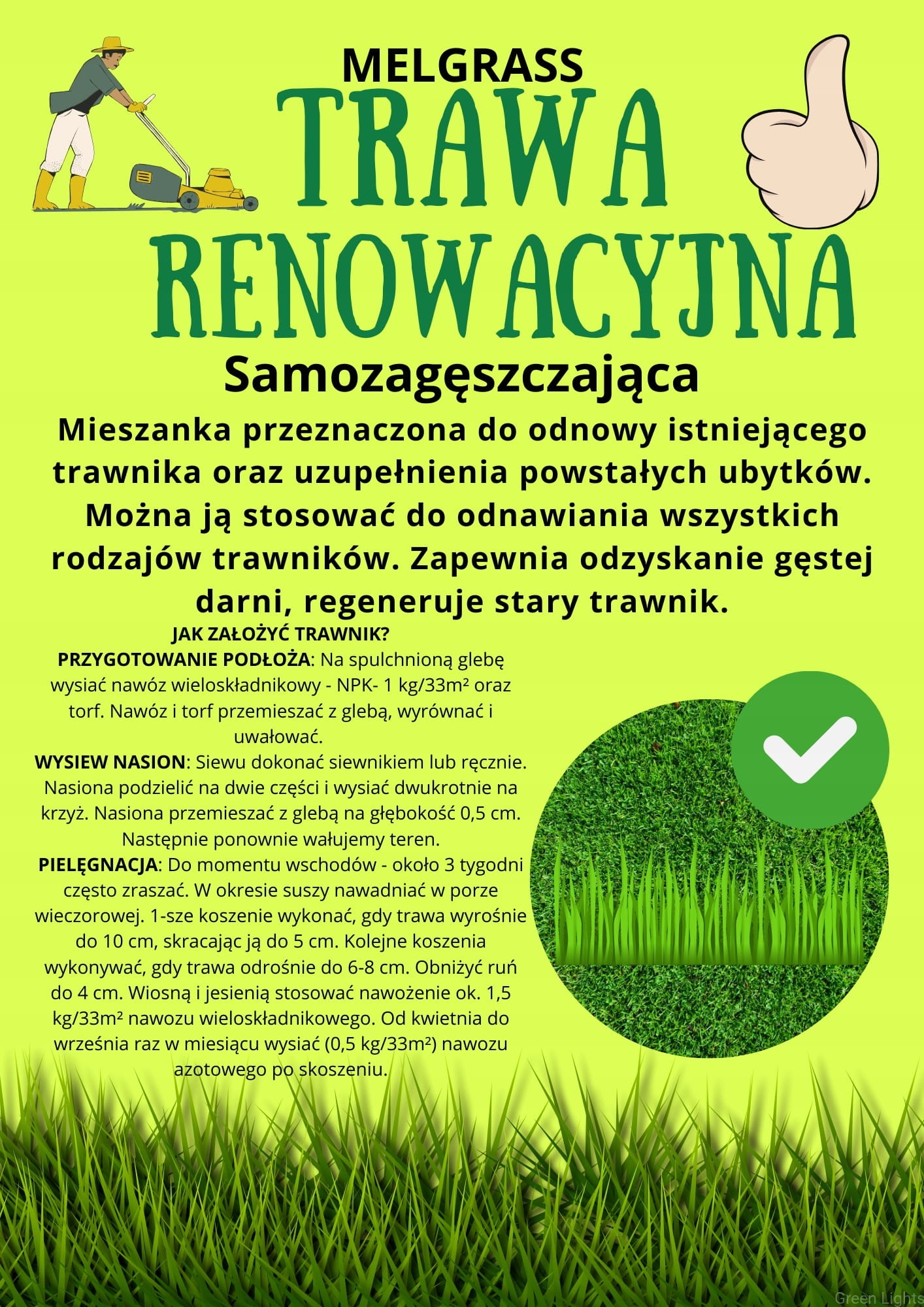 Trawa renowacyjna o szerokim zastosowaniu oraz wysokiej odporności na zmienne warunki atmosferyczne. Trawa Melgrass charakteryzuje się intensywnością krzewienia, wzrostem oraz wysoką odpornością na uszkodzenia mechaniczne. Mieszanka skomponowana aby trawnik był reprezentatywny, gęsty i cieszył oko właściciela :)