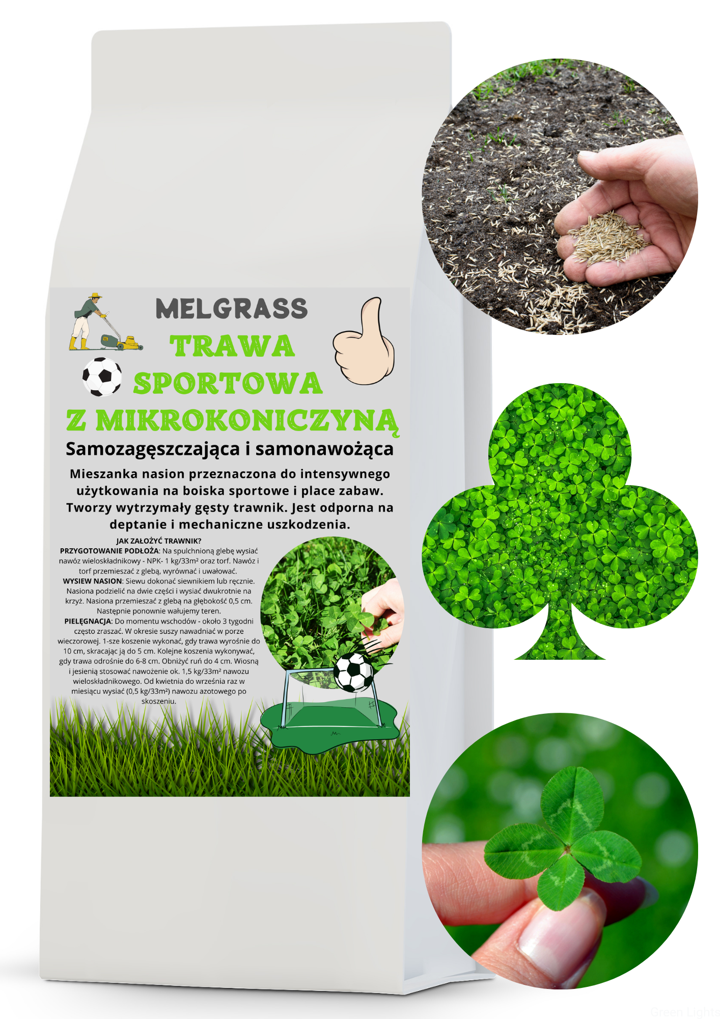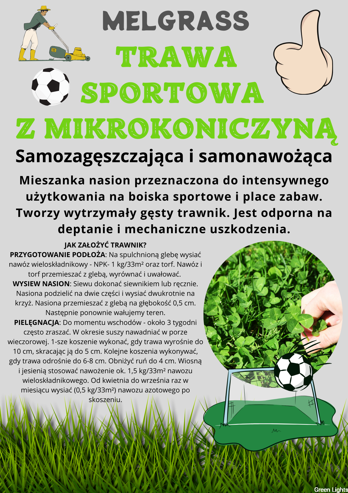 Trawa sportowa z mikrokoniczyną o szerokim zastosowaniu oraz wysokiej odporności na zmienne warunki atmosferyczne. Trawa Melgrass charakteryzuje się intensywnością krzewienia, wzrostem oraz wysoką odpornością na uszkodzenia mechaniczne. Mieszanka skomponowana aby trawnik był reprezentatywny, gęsty i cieszył oko właściciela :)