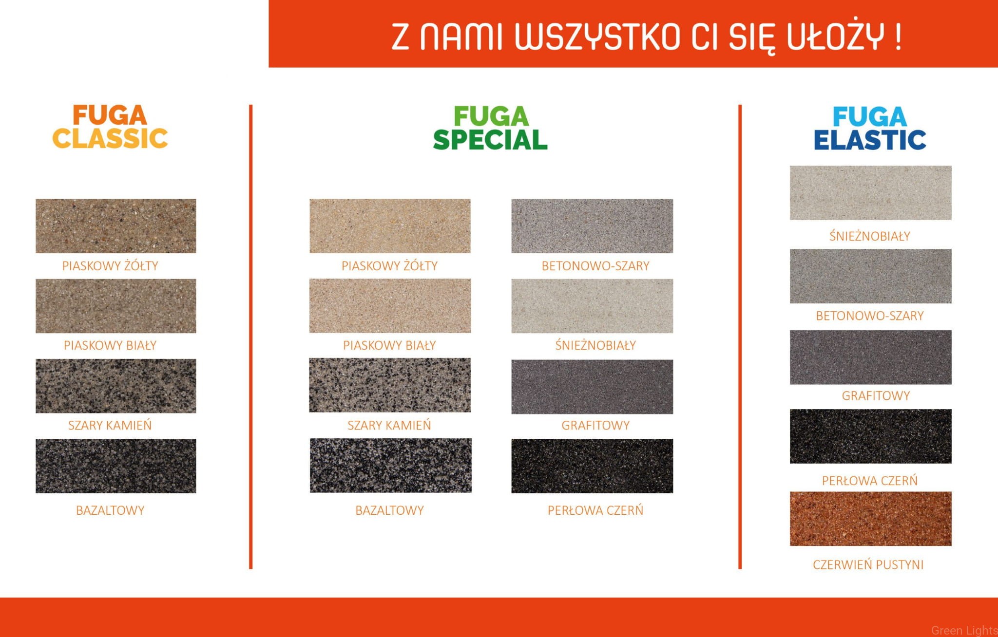 Fuga Special: Betonowo-szary, Śnieżnobiały, Piaskowy biały, Szary kamień, Piaskowy żółty, Grafitowy, Perłowa czerń, Bazalt.